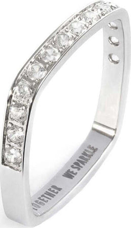 Anello fedina squadrata con cubic zirconia di diametro 2 mm. Nella parte interna è incisa la scritta "TOGETHER WE SPARKLE", logo Marlù e taglia presenti sui lati interni.