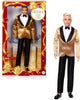 Bambola Ken con giacca dorata in raso, camicia bianca con colletto, pantaloni e scarpe nere, con papillon che aggiunge un tocco di eleganza.