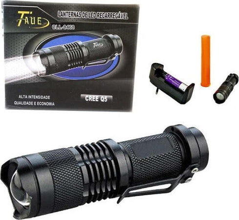Mini torcia tattica militare realizzata in lega di alluminio, impermeabile e antiurto, utilizza il LED cree che dura fino a 100000 ore, dotata di zoom che permette di allargare e restringere il fascio di luce per avere una luminosità più ampia o più profonda. È alimentata con una batteria ricaricabile al litio inclusa nella confezione insieme al caricabatterie da casa. Questa torcia è un prodotto ideale per uso notturno come questi occasioni: caccia, pesca, campeggio, ciclismo etc. È possibile, attraverso il tasto ON/OFF, selezionare tre modalità di illuminazione, massima potenza, modalità risparmio energetico, SOS. In dotazione nella confezione anche il segnalatore arancione in caso di guasto della propria auto e quindi per segnalare nella notte la presenza di auto guasta e persona su strada per i soccorsi stradali.