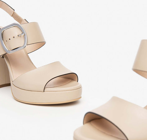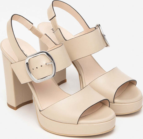 Nero Giardini sandalo in pelle con fascia larga e maxi fibbia. Interno in pelle, fondo gomma con plateau 3 cm e tacco a blocco 11 cm.