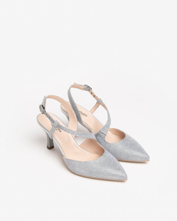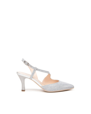 Slingback in tessuto glitter Nero Giardini. Con punta affusolata, interno in pelle e fondo gomma con tacco lucido satinato 7 cm. Made in Italy.