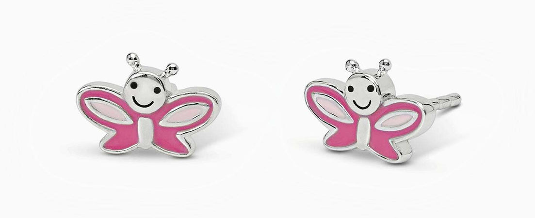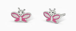 Orecchini bimba a lobo in argento rodiato con farfalla smaltata.