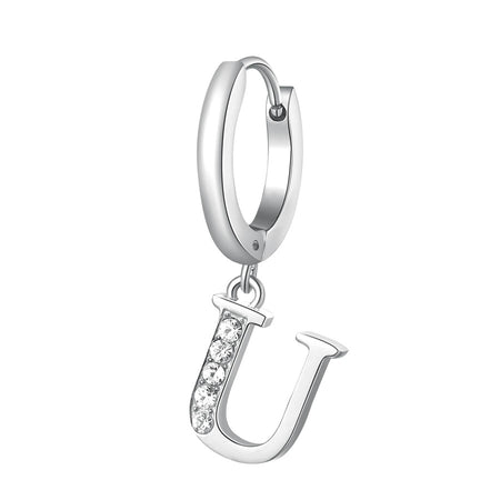 Orecchino singolo in acciaio 316L con pendente a forma di lettera U e cristalli.
