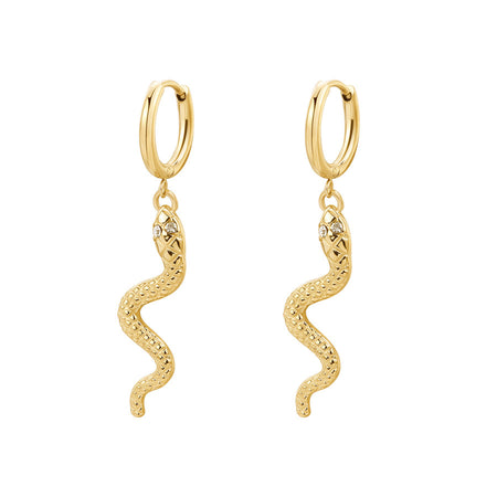 Orecchini pendenti in acciaio 316L e finitura pvd oro 14K, a forma di serpente e cristalli.