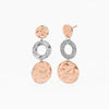 Orecchini in acciaio 316L con elemento martellato Ø 15 mm, elementi martellati con PVD rosé Ø 12 mm e 19 mm e cristalli Ø 1 mm, lunghezza totale orecchino 4.6 cm. Chiusura a farfallina.