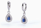 Orecchini in acciaio 316L con ciondolo pendente zaffiro sintetico 6x4 mm e cristalli Ø 1.25 mm. Diametro esterno cerchio 14 mm, lunghezza totale orecchino 3 cm.