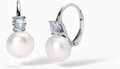 Orecchini da donna a monachella in argento rodiato con perle coltivate e acquamarina sintetica.