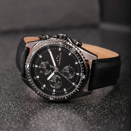 Orologio CHRONOSTAR da uomo collezione Race con cinturino in eco-pelle nera, cassa in acciaio nero 43 mm, quadrante nero con multi funzione. Movimento al quarzo