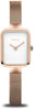 Orologio donna BERING della collezione Petite Square. Vetro piatto in zaffiro, meccanismo al quarzo, cassa color oro rosa brillante spazzolato in acciaio inox (spessore 6mm, larghezza 20mm, altezzaa 35mm), cinturino in maglia milanese lunghezza175mm, larghezza 8mm, chiusura a scatto, quadrante bianco, impermeabilità 3atm.