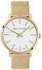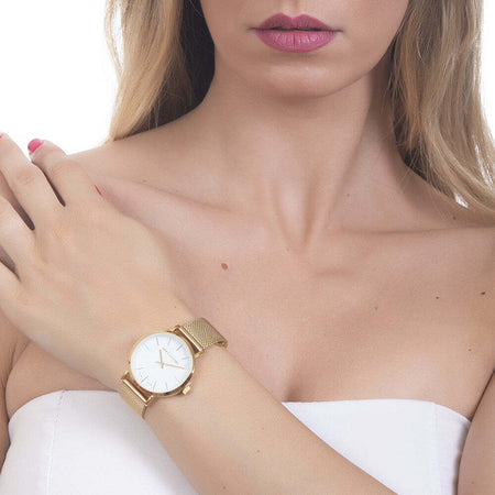 Orologio da polso da donna con quadrante circolare bianco, cassa, indici e lancette dorate, cinturino in acciaio maglia mesh dorato.