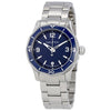 Lunetta fissa in acciaio inossidabile con anello superiore blu navy. Quadrante blu navy con lancette luminose color argento e indici delle ore. I numeri arabi segnano le posizioni delle ore 3, 9 e 12. Indici dei minuti attorno al bordo esterno. Tipo di quadrante: analogico. Lancette e indici luminescenti. Visualizzazione della data a ore 6.