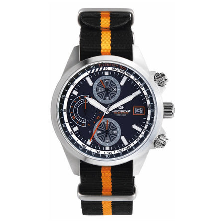 Orologio LORENZ da uomo collezione SOLAR E-POWERED con bracciale in acciaio, cassa in acciaio 42 mm, corono e fondello a vite. Vetro minerale. Impermeabilità 100 metri. Movimento al quarzo con carica solare Epson VR43, 3 contatori e data ore 3. Non necessita di cambio batteria. Special box Lorenz con incluso cinturino NATO colorato