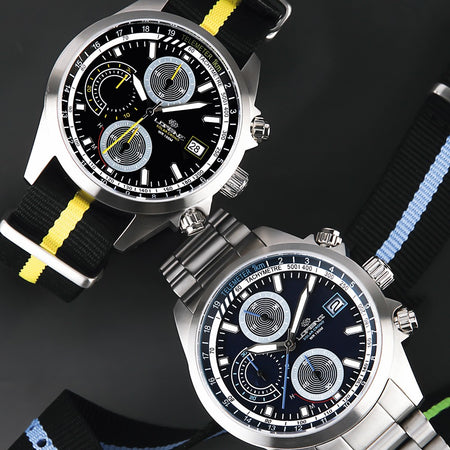 Orologio LORENZ da uomo collezione SOLAR E-POWERED con bracciale in acciaio, cassa in acciaio 42 mm, corono e fondello a vite. Vetro minerale. Impermeabilità 100 metri. Movimento al quarzo con carica solare Epson VR43, 3 contatori e data ore 3. Non necessita di cambio batteria. Special box Lorenz con incluso cinturino NATO colorato
