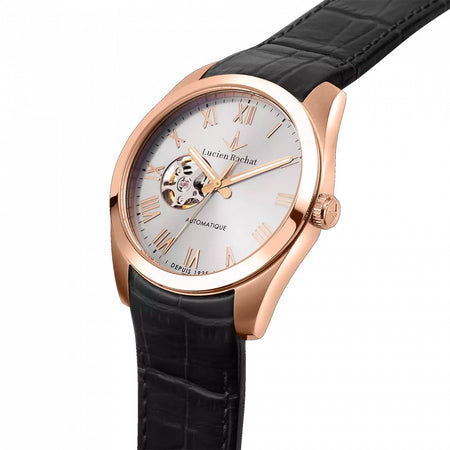 Orologio LUCIEN ROCHAT da uomo collezione Leman Automatico con cinturino in pelle nera, cassa in acciaio 41 mm, quadrante silver con movimento parzialmente a vista. Vetro in zaffiro antigraffio. Movimento meccanico automatico. Resistenza all'acqua 5 ATM