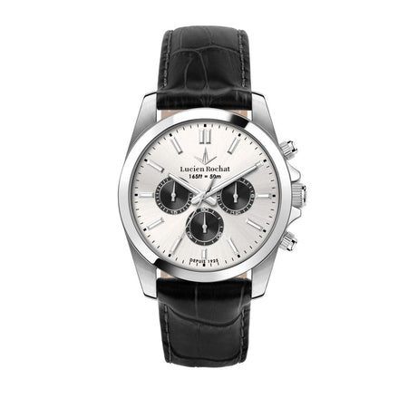 Orologio LUCIEN ROCHAT da uomo collezione Leman con cinturino in pelle nera, cassa in acciaio 41 mm, quadrante bianco con contatori neri. Cronografo e datario. Movimento al quarzo.