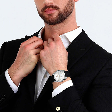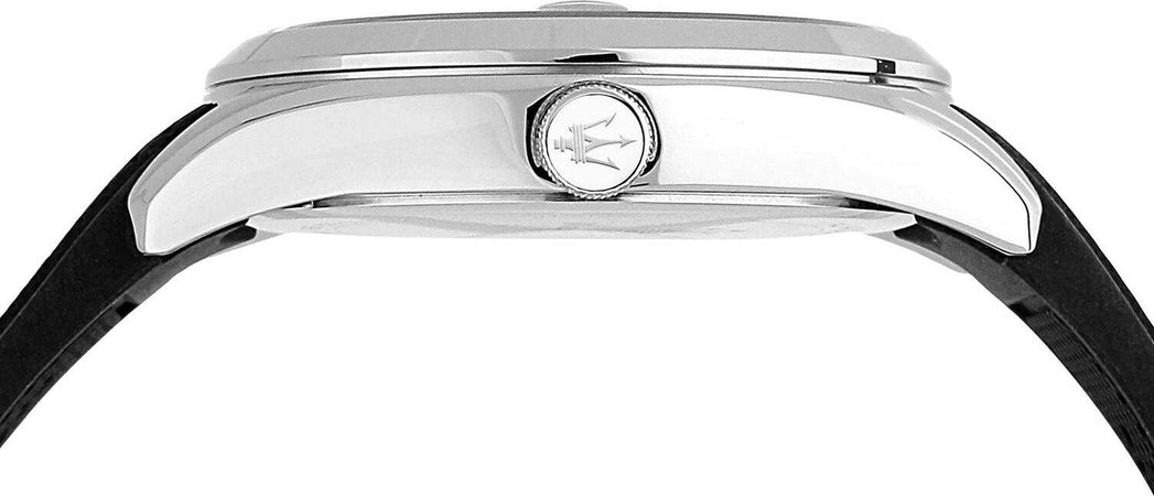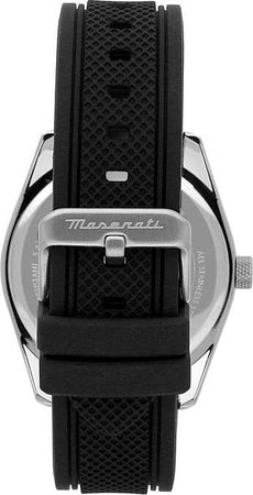 Orologio MASERATI da uomo collezione Attrazione con cinturino in gomma nera, cassa in acciaio 43 mm, quadrante bianco con datario. Movimento al quarzo. Resistenza all'acqua 5 ATM