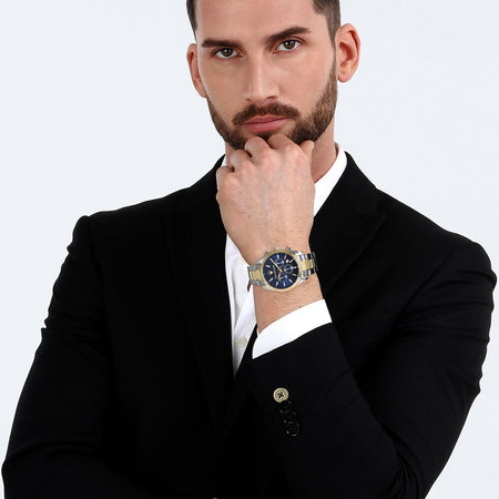 Orologio MASERATI da uomo collezione Attrazione con bracciale in acciaio bicolore, cassa in acciaio 43 mm, quadrante blu e oro con multifunzione e datario. Resistenza all'acqua 50 metri. Movimento al quarzo. Limited Edition - solo online