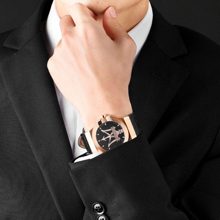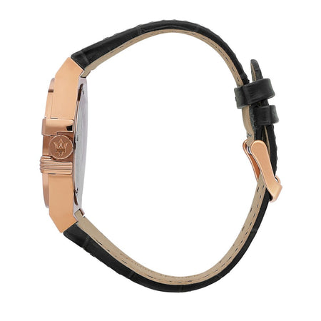 Orologio MASERATI da uomo collezione Potenza con cinturino in pelle nera, cassa in acciaio oro rosa 42 mm, quadrante nero con logo Maserati oro rosa e datario. Movimento al quarzo. Resistenza all'acqua 50 metri