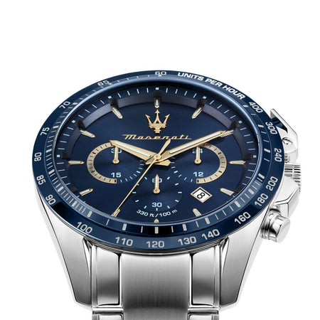 Orologio MASERATI da uomo collezione Traguardo con bracciale in acciaio, cassa in acciaio nero 44 mm, quadrante blu con cronografo con datario. Dettagli dorati. Movimento al quarzo. Resistenza all'acqua 100 metri. Collezione Limited Edition solo online
