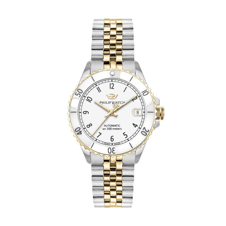 Orologio PHILIP WATCH da donna collezione Caribe Diver con movimento meccanico automatico, bracciale in acciaio bicolore, cassa in acciaio 36 mm, quadrante bianco con datario. Ghiera girevole bianca. Vetro in zaffiro. Diver professional 100 metri.