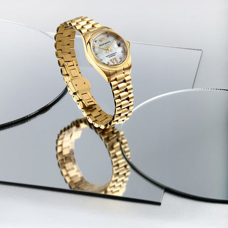 Orologio PHILIP WATCH da donna collezione Caribe con bracciale in acciaio dorato, cassa in acciaio dorato 31 mm, quadrante bianco con datario impreziosito da veri diamanti incastonati. Vetro in zaffiro antigraffio e antiriflesso. Movimento al quarzo Svizzero MVT.ETA F05.115. Fibbia FARFALLA con pulsanti. Resistenza all'acqua 100 metri