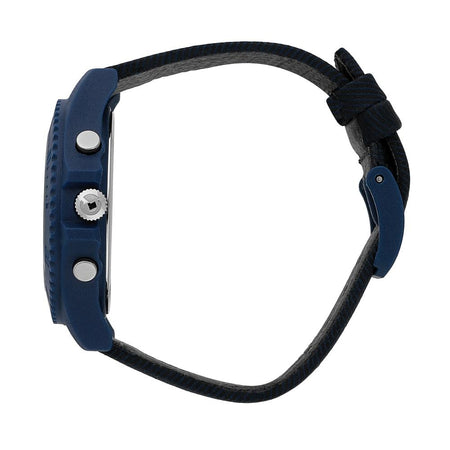 Orologio SECTOR da uomo collezione Save the Ocean con cinturino in pelle reciclata, cassa in policarbonato blu 44 mm, quadrante blu con cronografo e datario. Alimentazione a batteria solare. Movimento al quarzo. WR 5 ATM