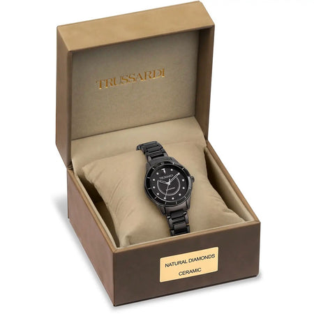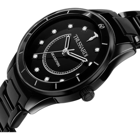 Orologio TRUSSARDI da donna collezione T-sky Diamond con bracciale in acciaio nero, cassa in acciaio nero 30 mm, quadrante nero con veri diamanti sugli indici. Movimento al quarzo.