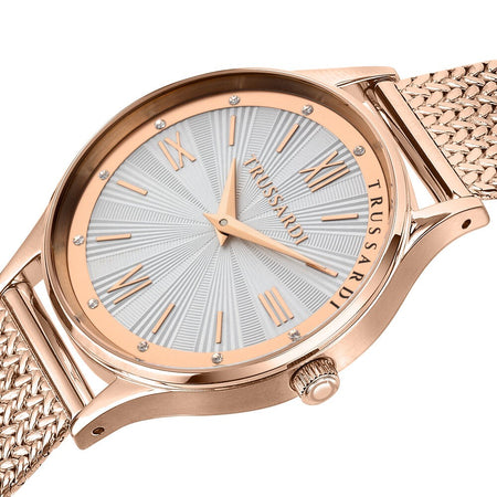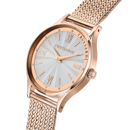 Orologio TRUSSARDI da donna collezione T-star con bracciale in acciaio oro rosa a maglia milanese, cassa in acciaio oro rosa 34 mm, quadrante bianco solo tempo. Movimento al quarzo. Resistenza all'acqua 50 metri