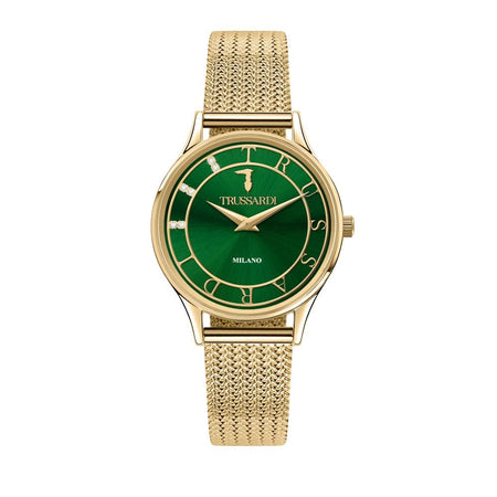 Orologio TRUSSARDI da donna collezione T-star con bracciale in acciaio dorato a maglia milanese, cassa in acciaio dorato 34 mm, quadrante verde solo tempo. Movimento al quarzo. Resistenza all'acqua 5 ATM