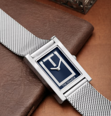 La cassa rettangolare in acciaio misura 24x35 mm ed è protetta da vetro minerale resistente. Il quadrante blu con logo Trussardi dona uno stile raffinato e contemporaneo, perfetto per ogni occasione.