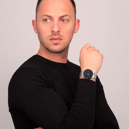 Orologio TRUSSARDI da uomo collezione T-couple con bracciale in acciaio, cassa in acciaio 41 mm, quadrante nero. Movimento al quarzo. Resistenza all'acqua 5 ATM