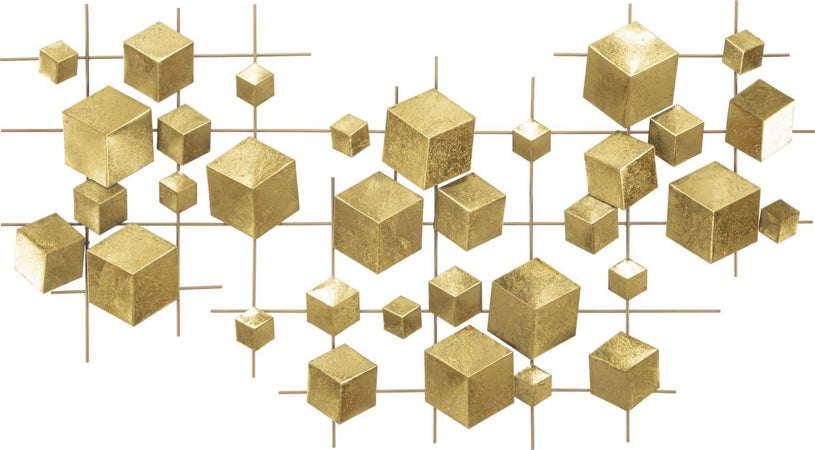 Pannello astratto in metallo dorato dal design geometrico che dona profondità. I pannelli 3D sono il nuovo trend per decorare le pareti. Il metallo si declina in forme geometriche, vegetali o animali che conferiscono un'allure glamour e sorpendente ad ogni ambiente