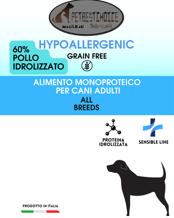 PETBESTCHOICE con il 60% di  proteina idrolizzata  grainfree è un alimento completo per cani di tutte le razze che si distingue per un uso elevato di proteina animale, eliminando completamente il problema delle sensibilità verso i cereali che molte volte creano problemi in questa categoria di prodotti!
