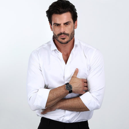 Il cinturino in silicone nero garantisce massima comodità e resistenza, mentre la chiusura a farfalla con pulsante laterale assicura un’ottima vestibilità.