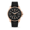 La cassa da 43 mm in acciaio color oro rosa, con finitura lucida e satinata, ospita un quadrante nero essenziale con datario al 3, protetto da vetro zaffiro antiriflesso.