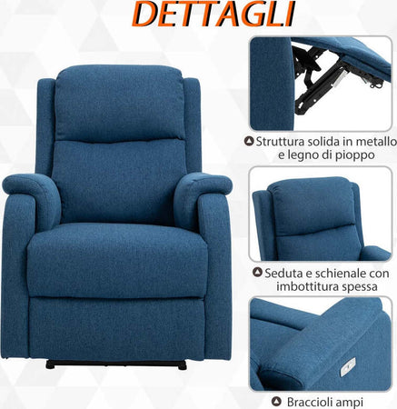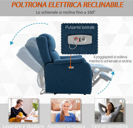 Poltrona Relax Elettrica con Schienale Reclinabile 160°, Poggiapiedi e Porta USB, Lino Blu, 77 x 91 x 106cm CV2833-844CV2