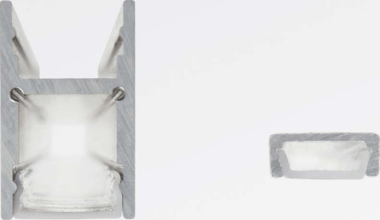 Profilo in alluminio estruso con superficie anodizzata o verniciata a polveri, disponibile nelle finiture bianco, nero e alluminio, diffusore in PMMA satinato.. Sono disponibili barre in diverse sezioni e lunghezze nella versione RECESSED per installazione.