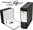 Registratore STARLINE modello StarBox con struttura in cartone rivestita in carta goffrata stampata e risguardo bianco. Dotato di meccanismo a leva in acciaio nichelato con pressino. Custodia in fibrone nero rivestita in carta usomano. Anello di estrazio