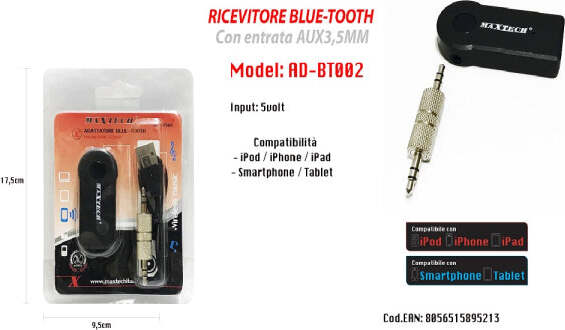 Ricevitore Adattatore Jack 3.5mm Vivavoce Bluetooth Stereo Audio Maxtech Ad-bt002