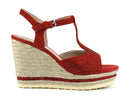 Sandalo modello "t" su zeppa corda con camoscio e strass