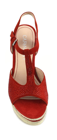 Sandalo modello "t" su zeppa corda con camoscio e strass