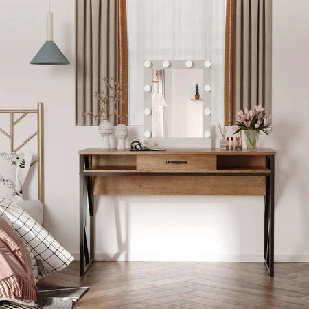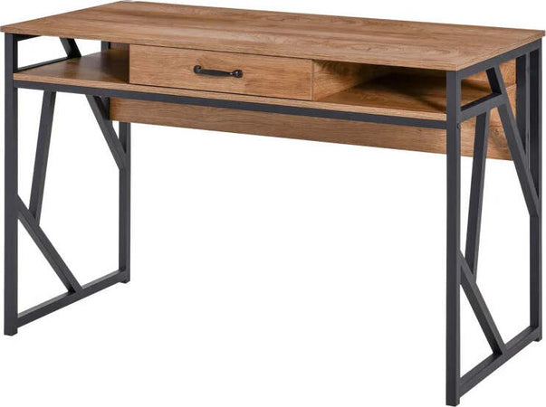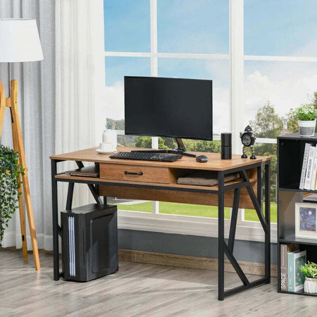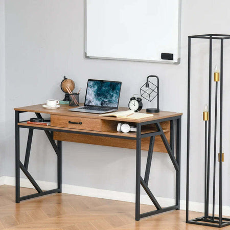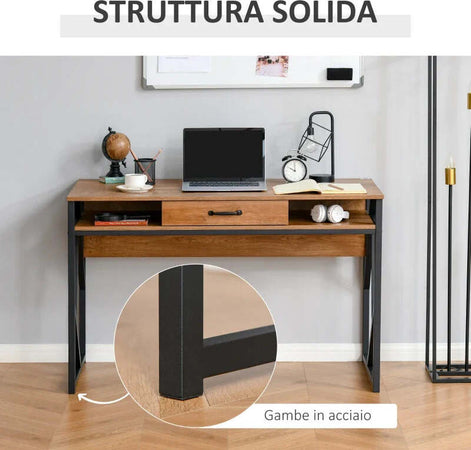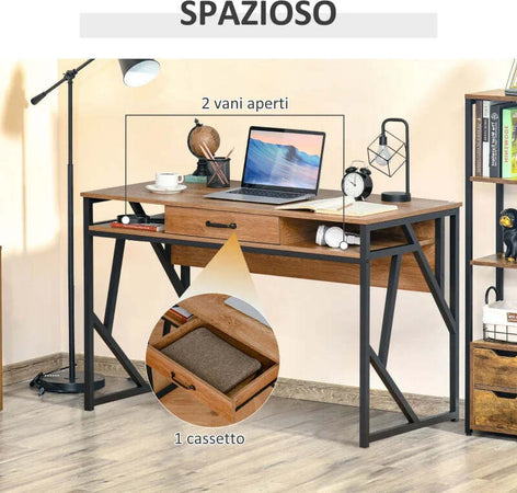 Scrivania Moderna in Metallo e MDF Stile Industriale, Mensole e Cassetto per Casa e Ufficio, 120x60x76cm Nero Marrone XV2836-376XV2