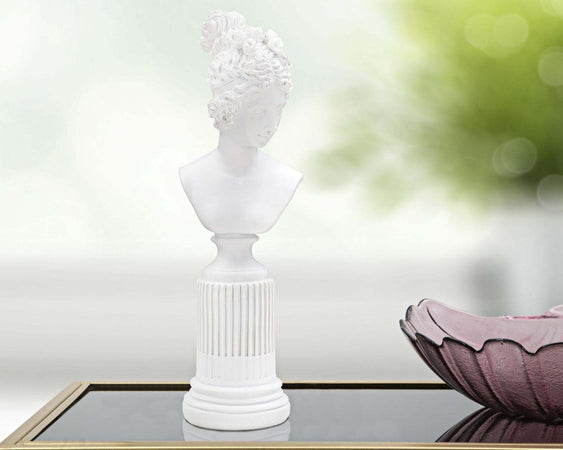 Elegante statua di busto di donna poggiato su di una colonna. Le linee richiamano l'arte classica.