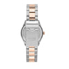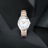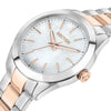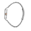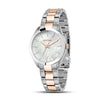 Il cinturino in metallo bicolore unisce tonalità silver e oro rosa per un look moderno e sofisticato, mentre la chiusura diver con blocco di sicurezza garantisce una perfetta aderenza al polso.