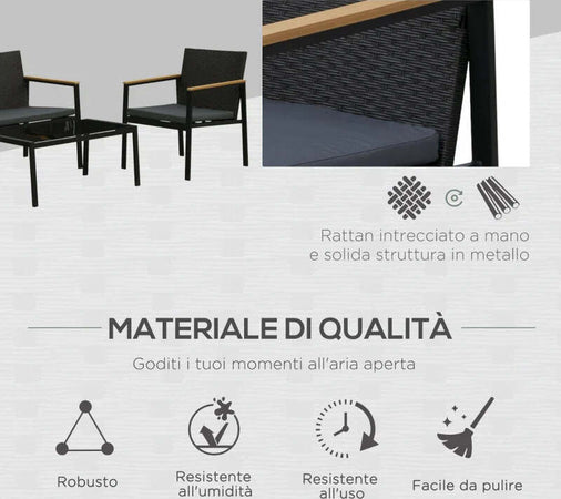 Set 4 Pezzi Salotto da Esterni con 2 Sedie, Divano e Tavolino Mobili da Giardino in Rattan e Acciaio Nero 860-092