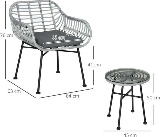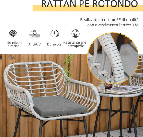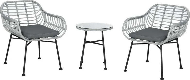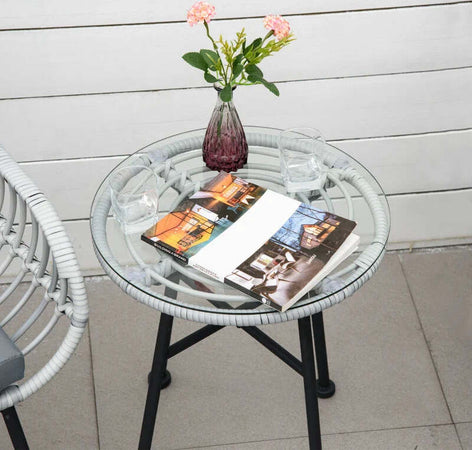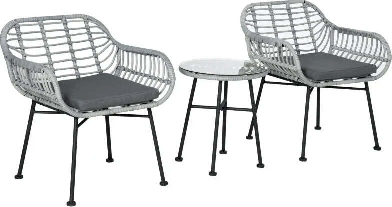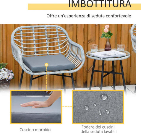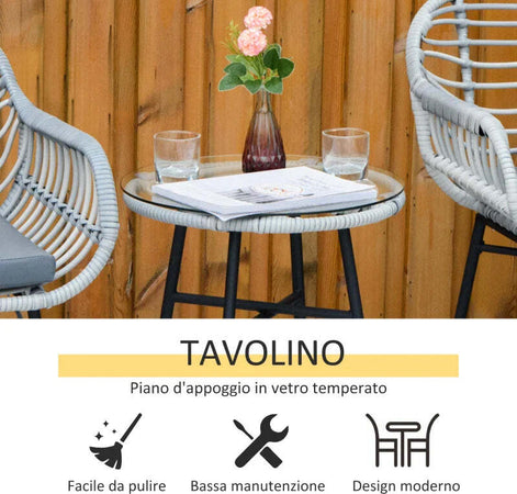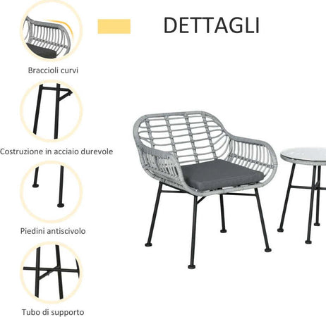 Set Mobili da Giardino in Rattan PE con 2 Sedie e Tavolino con Ripiano in Vetro, Grigio 863-085