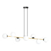 Sospensione con rosone e dettagli in acciaio nero, struttra lineare in acciaio oro, completata da 8 diffusori a sfera in vetro bianco; altezza regolabile