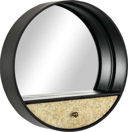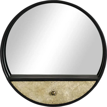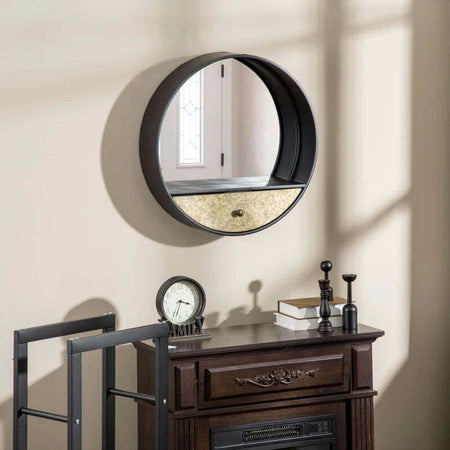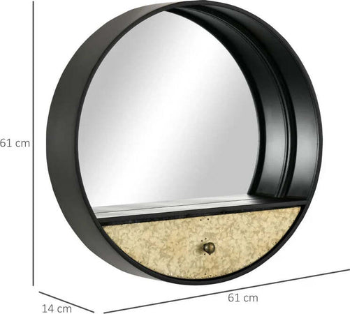 Specchio da Parete Rotondo da Ø61cm con Cassetto e Cornice in Metallo Nero UJ6830-474UJ6
