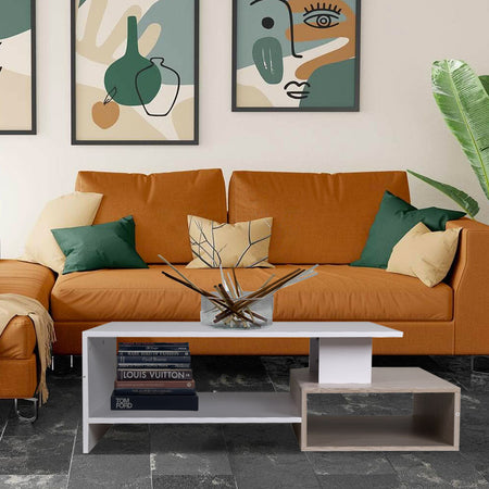 Realizzato con una solida struttura in legno MDF di altissima qualità in un elegantissimo colore bianco con ripiano inferiore in colore quercia che dona un tocco davvero unico a questo fantastico coffee table.