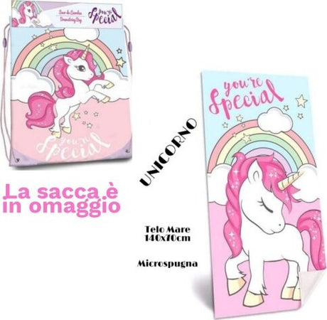 Telo mare unicorni rosa: magico e con sacca omaggio! Morbido, colorato e assorbente, perfetto per le giornate al mare. Aggiungi un tocco di incanto al tuo stile estivo e ricevi una sacca pratica in omaggio. Goditi il mare con i tuoi unicorni preferiti!
